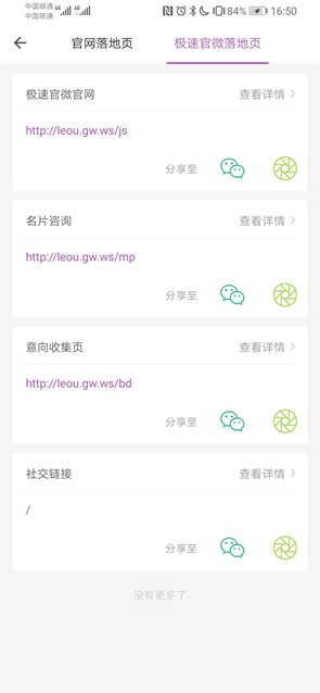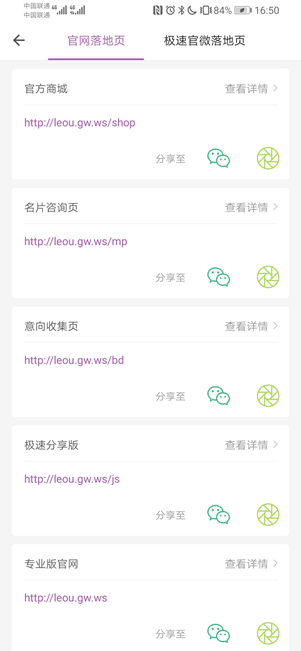 【新增】落地页功能页面,呈现当前官网及极速官微的落地页,支持分享到微信好友及微信朋友圈;