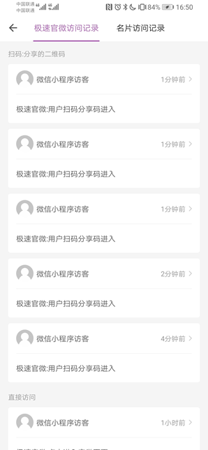 【新增】名片访问记录,显示官微名片的访客记录,包括访客昵称,访问记录,访问时间等;