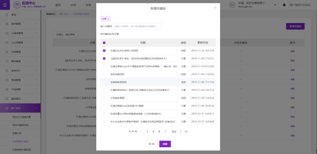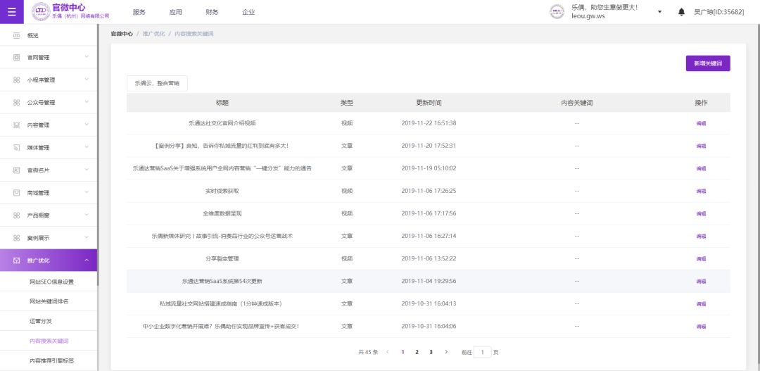 【新增】新增内容搜索关键词,呈现当期企业内容关键词,包括文章和视频。支持关键词编辑,新增关键词到不同内容等
