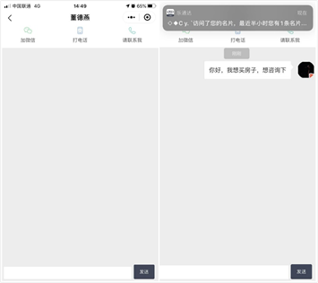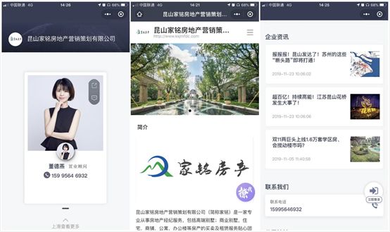 相比于纸质的名片来说,智能名片动态的展现效果会更直观,更易于理解。尤其智能名片基于移动互联网的内容最大的优势在于,一键转发功能。就真实的房产经纪人的工作场景来说,房产经纪人可以在联系看房者之初,通过微信将智能名片发给看房者,看房者可以通过智能名片即可查看房产经纪人的个人展示信息,房地产企业信息等,提前了解。同时,一键转发有益于宣传,一个真实用户的转发,就是最好的宣传。