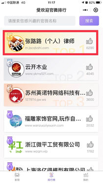 通过律所律师们的不断分享传播,张路路(个人)律师的极速官微小程序也取得了不错的数据,访客多大6000余条,点赞数6290个,成为了最受欢迎官微排行第一名。