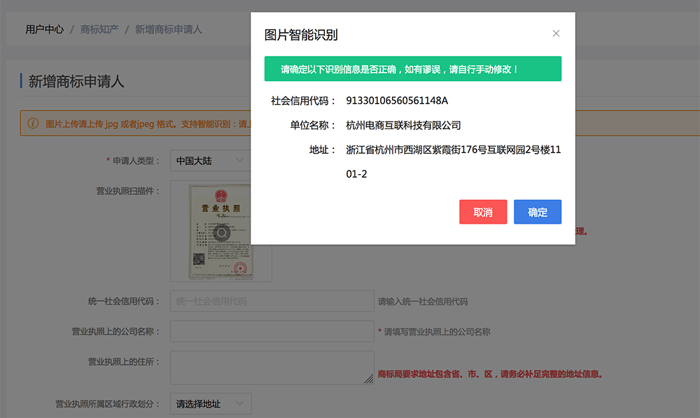 用户可在线创建商标申请人,创建完成后商标申请人资料可在商标申请人管理表单查看管理,方便用户商标注册。一次创建,重复使用,并且支持商标申请人证明文件AI智能识别,减少资料填写时间!