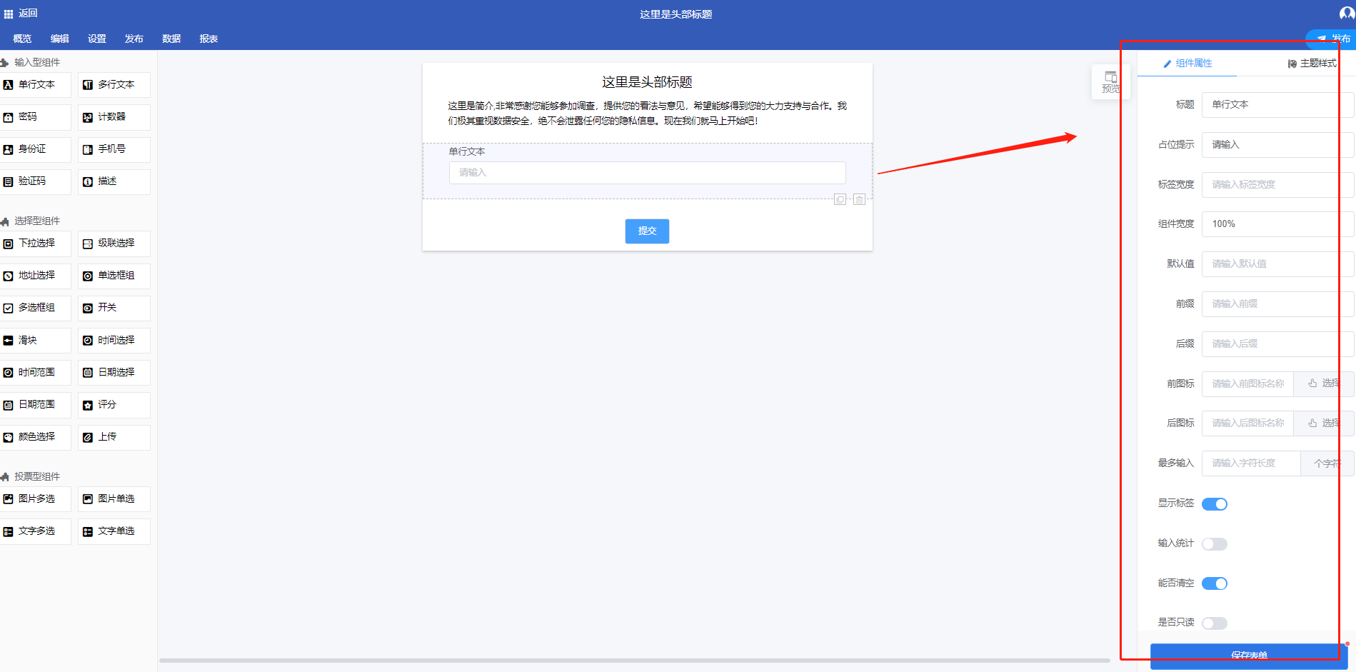 五、点击我们添加的组件,在屏幕右方就会出现这个组件的属性设置,包含“组件属性”和“主题样式”两个模块,我们可以在组件属性中修改这一栏的标题、描述、选项类、是否必填、是否唯一等基础信息;