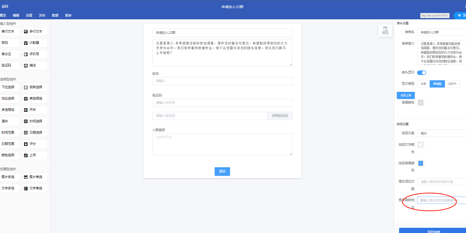 七、将“复制文件链接”粘贴至“提交跳转地址”,即可实现表单提交后,自动跳转为二维码,客户可扫码添加