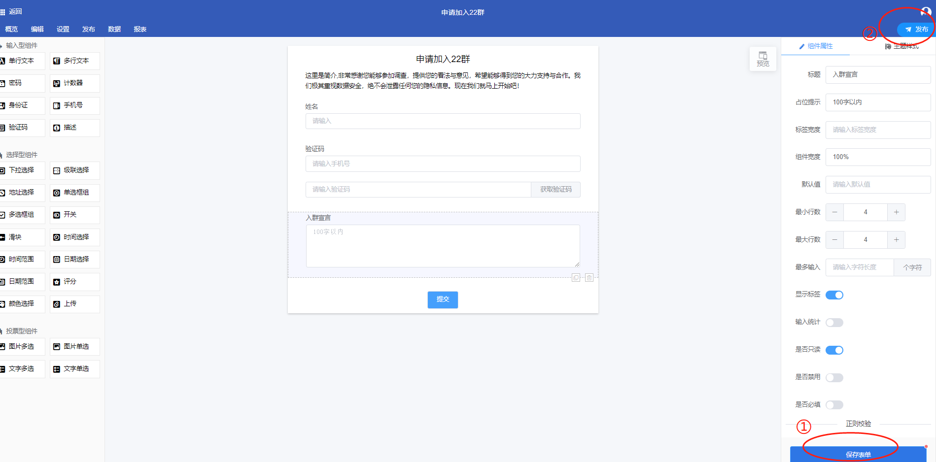 三、打开编辑器后,在左侧可以看到能够添加到表单中的组件,这里分为“输入型组件”与“选择型组件”;