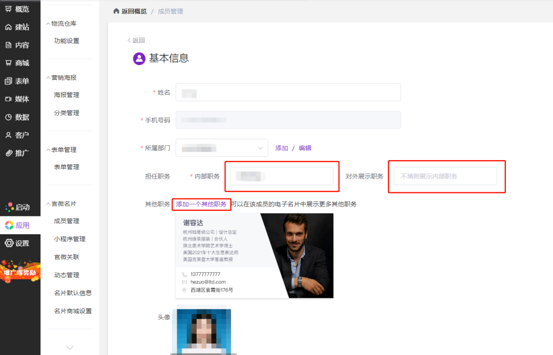 3)填写其内部职务和对外展示职务,如未填写对外展示职务官微名片将显示内部职务,点击添加一个其他职务即可添加多个「其他职务」的单位名称和职务名称,并调整所有职务的显示顺序。你可以将其他职务作为第一个。