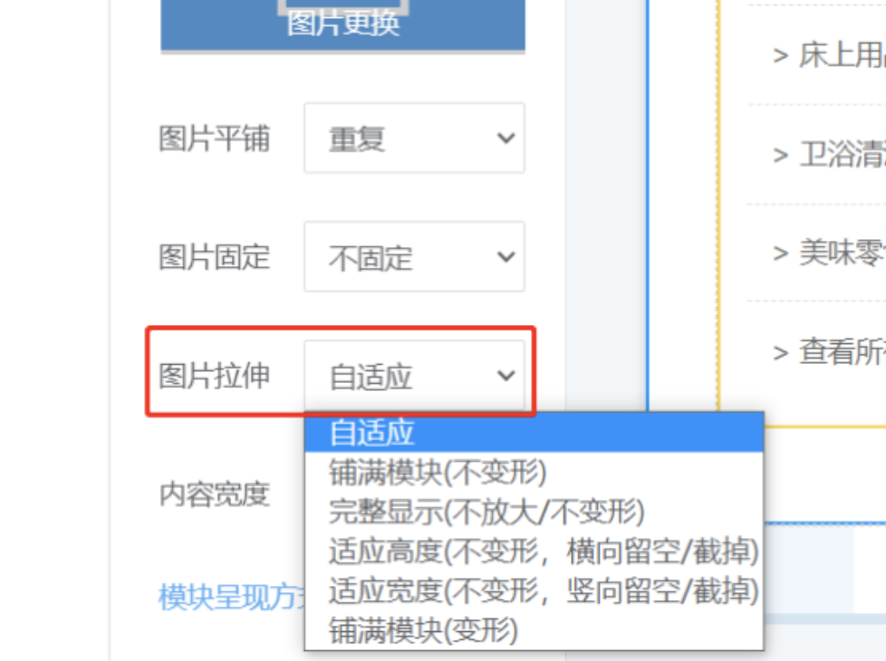 背景图高度将与模块保持一致,超出的部分将被截掉、宽度不够时候将会留下空白区域