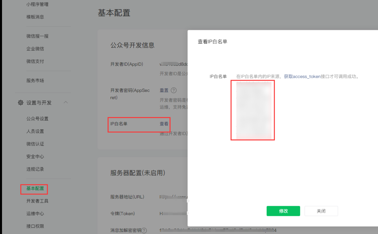 3、公众号开发者信息中 ip白名单是否有填完全。