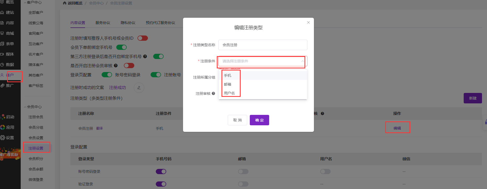 会员注册设置操作步骤:如果官网需要添加用“用户名”和“邮箱”注册方式注册会员账号,需要在后台设置中添加下这两项。进入【官微中心】后台左侧导航【客户】-【会员中心】-【注册设置】在注册名称栏找到默认“注册条件”是手机这条,点击后面的“编辑”进入编辑界面,在“注册条件”选择栏,讲下拉框中“手机”、“邮箱”、“用户名”三项全部选中,点击“确定”保存。如“注册名称”列表中还有其他的全都删除掉。