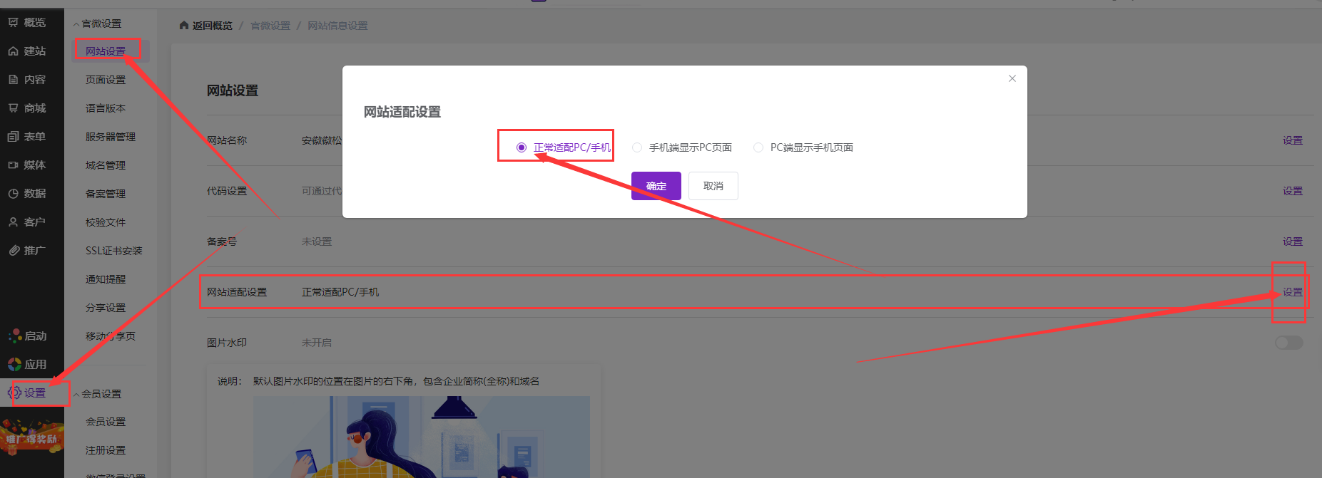网站适配设置操作步骤: