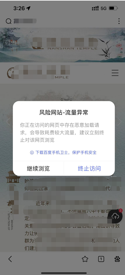 用手机百度浏览器打开网站提示“风险网站-流量异常”如下图所示,这是什么原因?