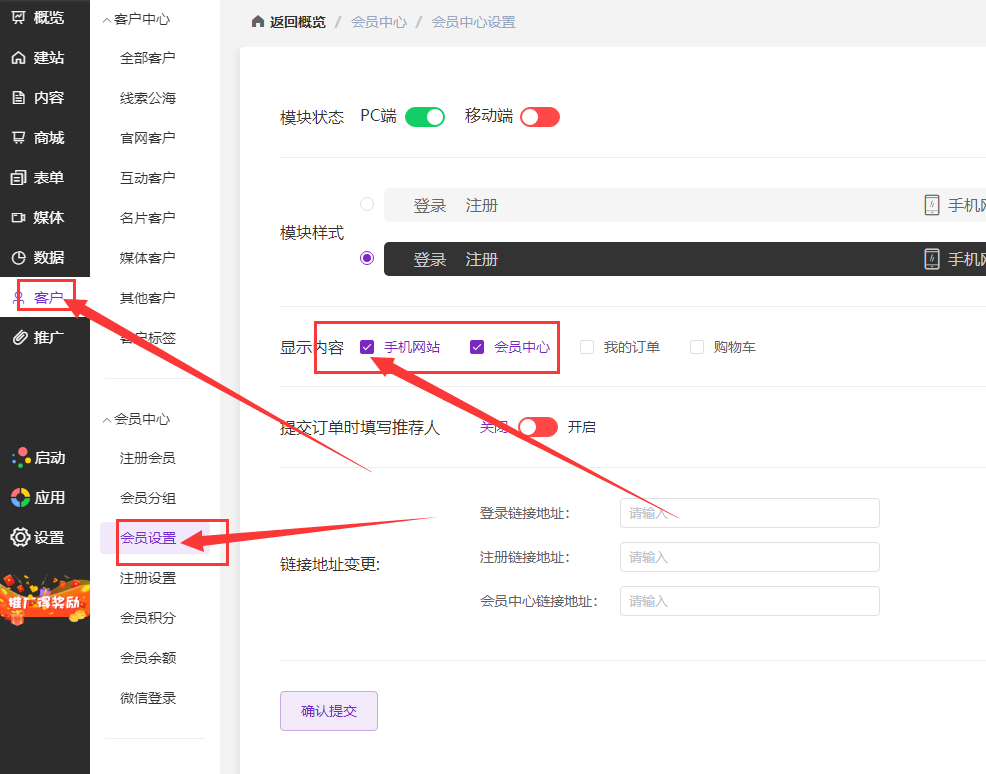 官微中心后台-客户-会员中心-会员设置,显示内容栏将这两项前面的勾选取消,点击“确认提交”。刷新下网站即可隐藏了网站页面右上角这两项。