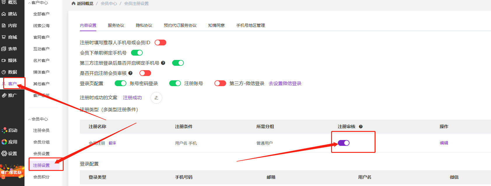 官微中心后台-客户-会员中心-注册设置,在“注册类型”中“注册审核”栏开启按钮即可开启注册审核功能。