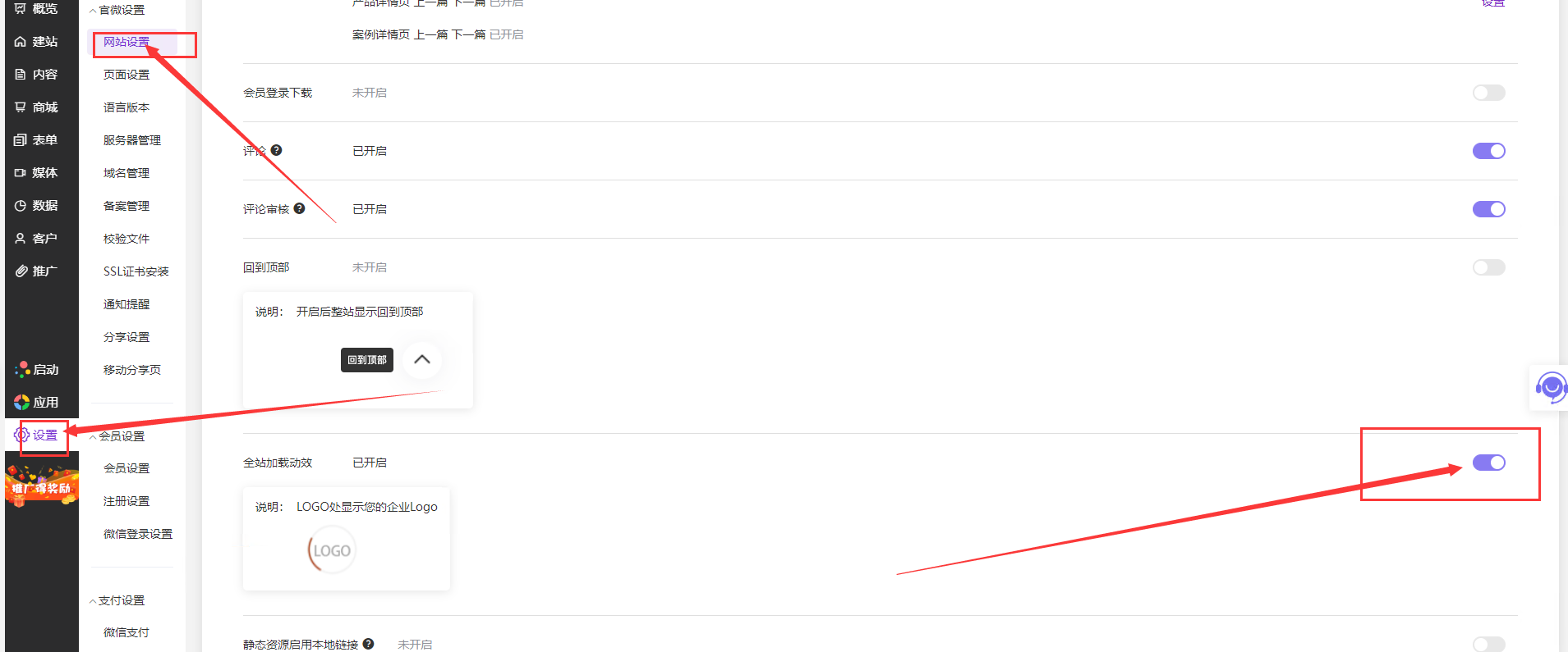官微中心后台-设置-网站设置找到“全站加载动效”,点击后方的开关关闭即可。