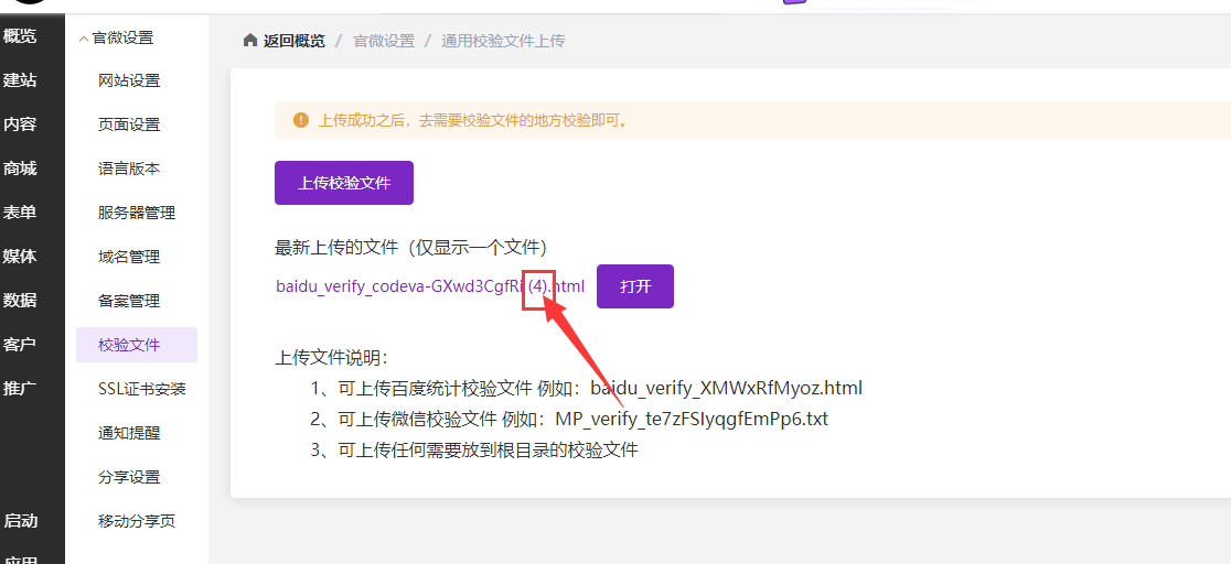 将下载的验证文件名称中括号部分删除,跟下载提示页处显示的验证文件名称一致,然后重新上传下。