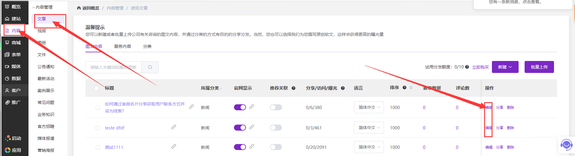 1、登录官微中心后台-内容-文章,在文章列表中点击编辑进入文章编辑界面。