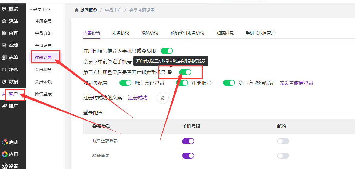 登录官微中心后台-客户-会员在线-注册设置,如下图所示,开启下“第三方注册登录后是否开启绑定手机号”。