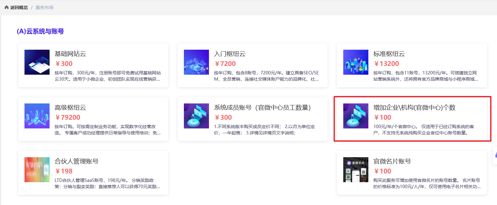 2、官微中心后台左上角“服务”进入服务市场,在“系统与账号”分类找到“增加企业/机构(官微中心)个数”服务,点击购买服务费后即可重新创建企业。