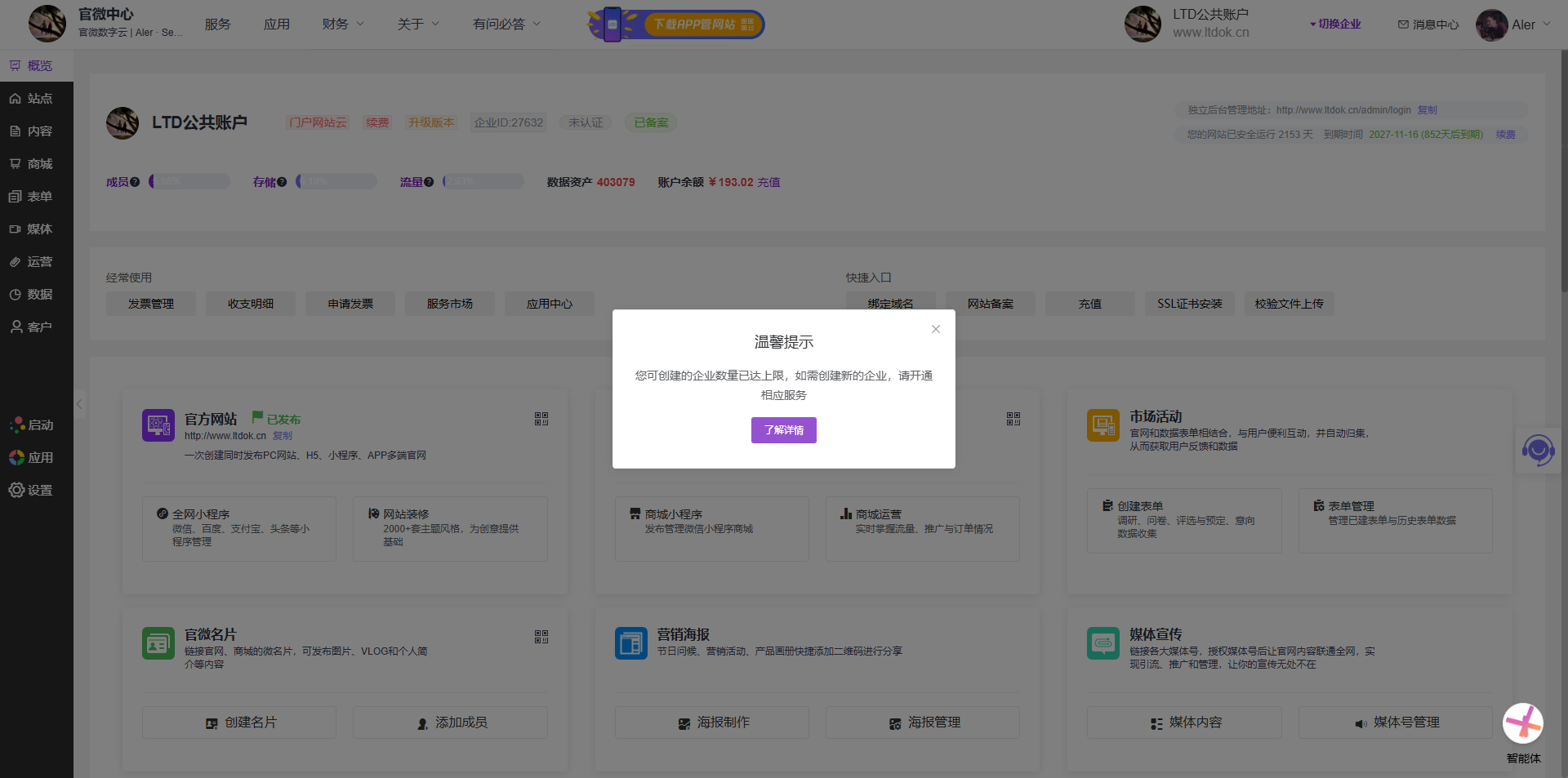官微中心后台账号默认只能创建一个企业,如果想要创建多个就需要购买“增加企业/机构(官微中心)个数”服务。