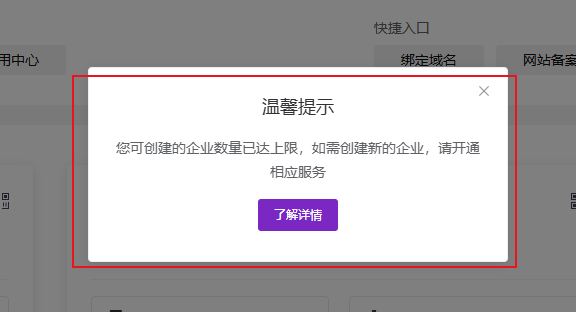 官微中心后台点击“创建企业/团队”,出现如下图所示提示,这个要怎么处理才能继续创建呢?