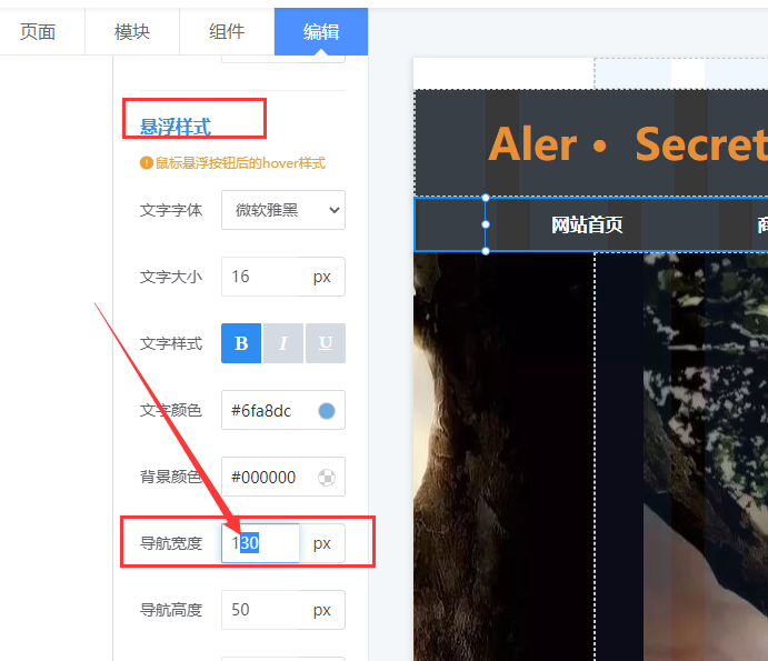 官微中心后台-网站装修,进入网站编辑界面。点击导航进入导航组件编辑,在左侧编辑栏“一级栏目”中“基础样式”-“导航宽度”数值,跟下方“悬浮样式”中的“导航宽度”数值保持一致。还有“左右间距”两处的数值也要保持一致。调整好之后点击页面右上角“保存、发布”。