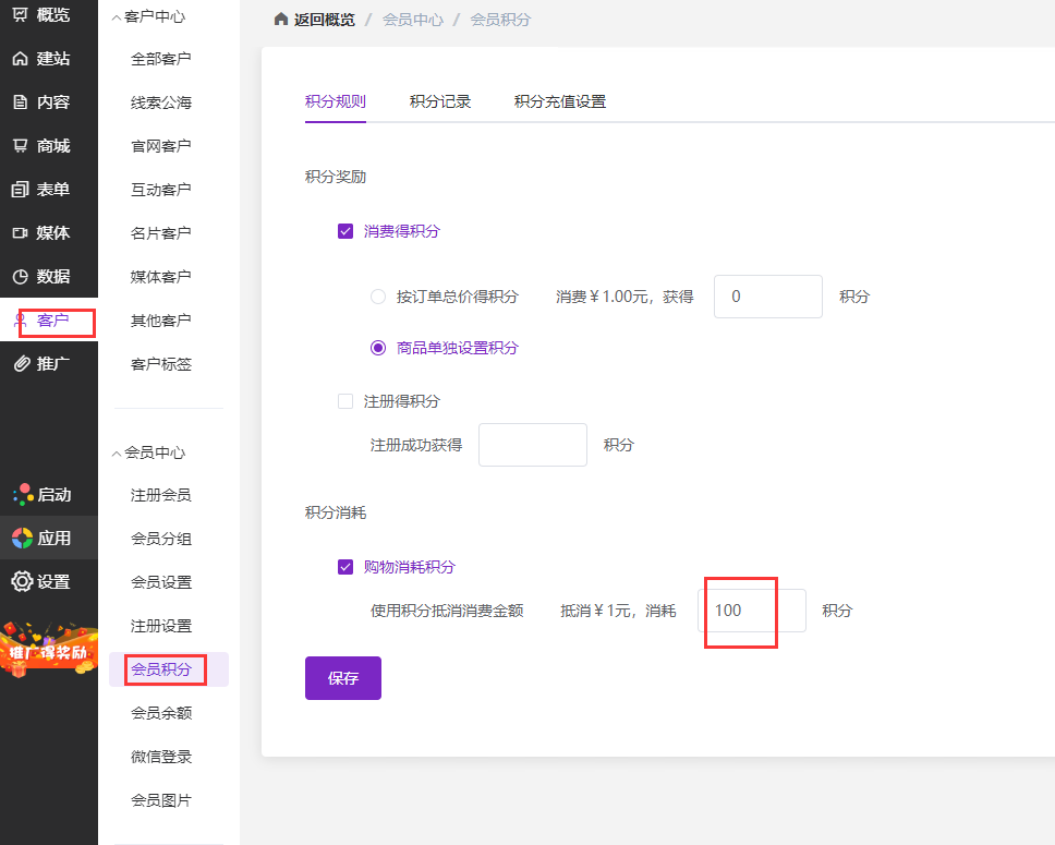 官微中心后台-客户-会员中心-会员积分,在“积分消耗”栏中可以自定义设置抵扣积分,如下图所示: