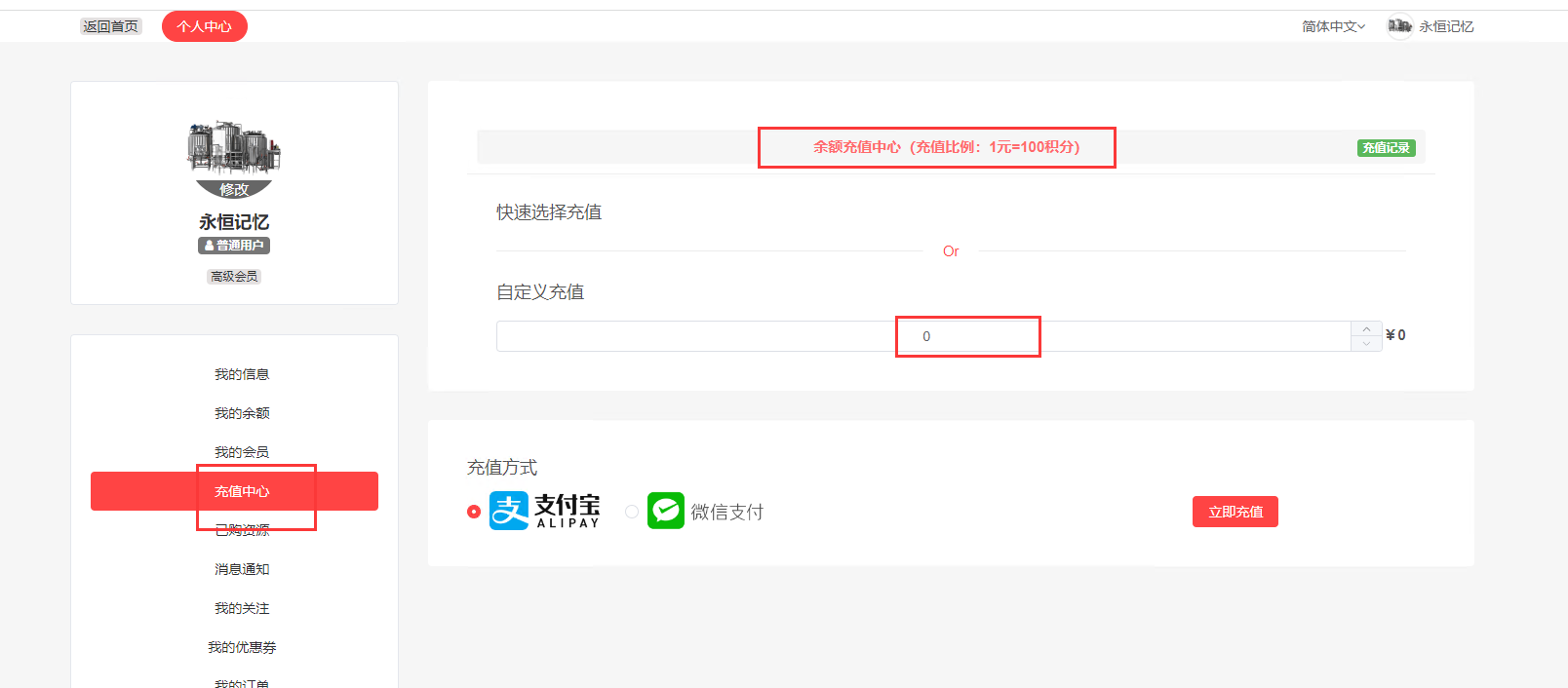 2、会员登录个人中心在“充值中心”可以根据需求自定义充值积分,兑换比例按照后台设置的好的比例换算成人民币,可以通过微信或者支付宝进行支付。