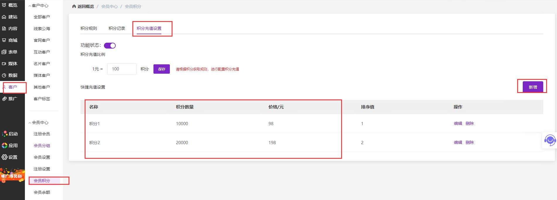 1、官微中心后台-客户-会员中心-会员积分-积分充值设置,在“快捷充值设置”栏点击“新增”设置几个固定积分和价格。标价可以设置成比按比例兑换时优惠一些。