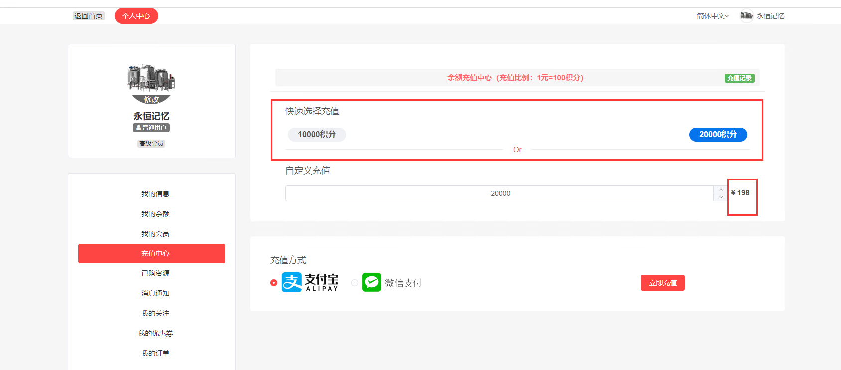 2、会员登录个人中心在“充值中心”快速选择充值栏选择充值积分,选择后通过微信或者支付宝进行支付。