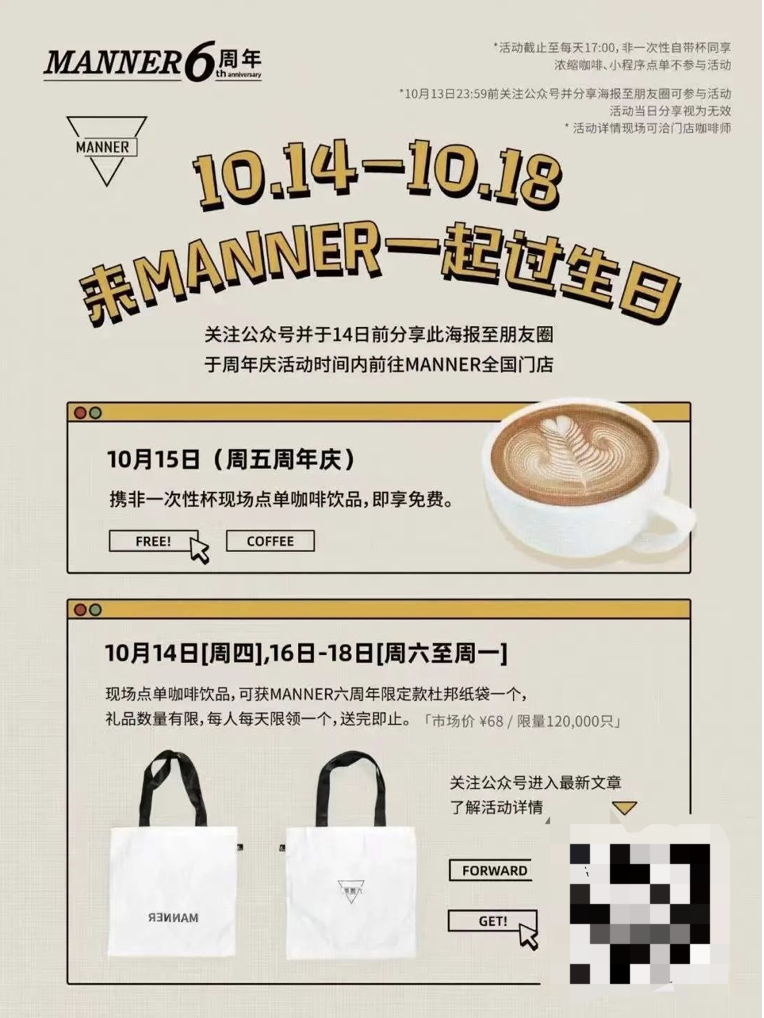# 活动设计拆解若想了解企业的私域运营,就必须清楚其用户路径如何运作。通过Manner咖啡的一场6周年咖啡活动,可以解析其用户路径图如何规划设计。这是Manner的6周年咖啡免费领活动,整场活动的规则如下: 关注公众号并与14日前分享此文推文至朋友圈,于周年庆活动期间前往Manner全国门店。15日(周年庆)携带一次性杯现场点单咖啡饮品,即可享受全额免费。同时在14日、16-18日期间,现场点单咖啡饮品,还可以获得Manner六周年限定款杜邦纸袋一个。 活动海报: