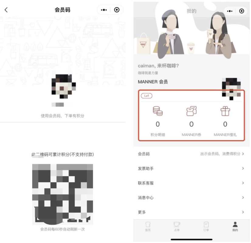 社群亮点是Manner各门店社群均有咖啡师出现在群内,统一ID为“Manner Barista + 咖啡师昵称”,根据统计,平均每个群中约有5-6名Manner咖啡师。这些“人气咖啡师”也成为吸引复购的重要因素。# 会员体系拆解Manner的会员机制是积分制,目前只有在淘宝店内和微信小程序中有看到会员的入口。### 淘宝会员体系会员的机制相对简单,淘宝店内普通会员消费1元可积1分,1000积分可以兑换10元优惠券。