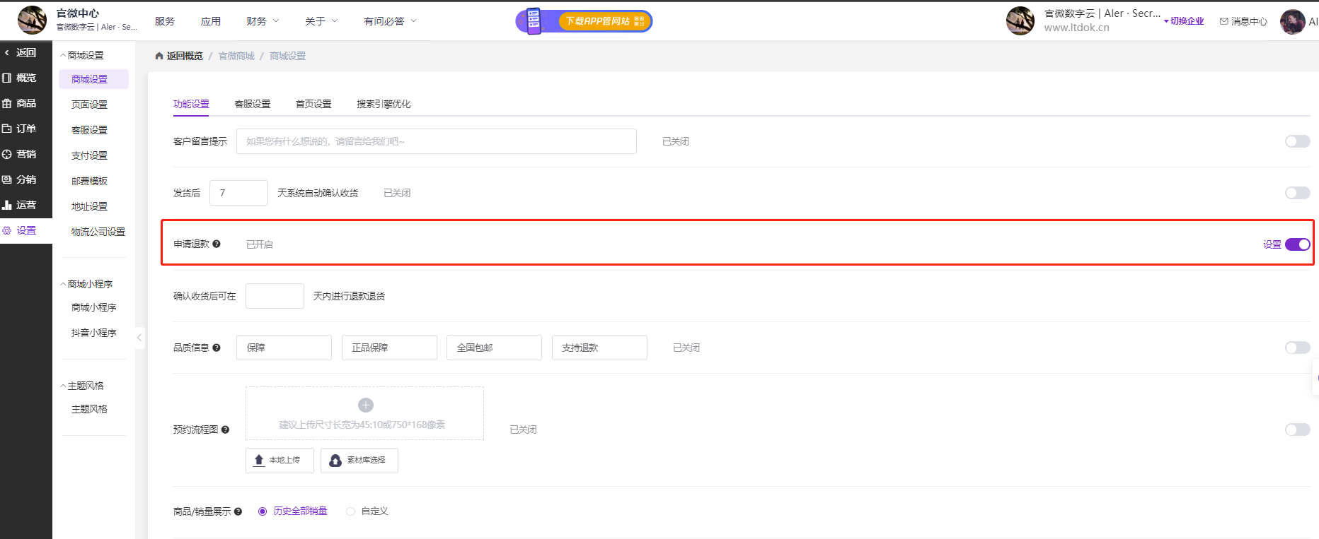 官微中心 - 商城-设置 - 商城设置。找到图中圈起的 申请退款 设置,将其设置为关闭后,在我的订单中将不显示申请退款的入口。