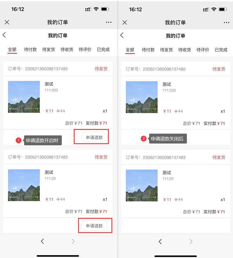 申请退款开启和关闭时,我的订单页面对比如下图所示: