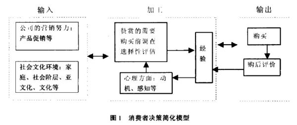 消费者决策是一个问题解决的过程,它包括三个独立而又密切相关的阶段,即输入、加工和输出阶段。这些阶段被描述成消费者决策简化模型,该模型(见图1)与影响消费者决策的所有个体和团体方面的因素都有联系。