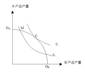 ①生产可能性曲线是在现有资源、技术和组织条件下产量达到最大限度的各种产品组合的轨迹。如下图的OAOB曲线。生产可能性曲线上任一点切线斜率等于边际转换率(MRT)