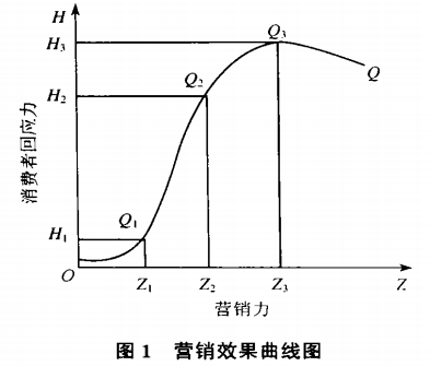 企业营销通过计划、组织、实施和控制等管理环节,理论目标应当是实现营销效果最佳化和营销收益最大化。但是,这并不应该表现为营销活动最多和营销力强度最大,而应当表现为营销的适度性,即适度营销。也就是说,企业只有进行适度营销才能使营销效果达到最佳状态,实现营销收益的最大化。图1中,当营销主体的营销力Z分别增长到z1、z2和z3时,消费者回应力H也因此增长到H1、H2和H3(当然,这种增长不一定具有比例性),二力相交相应产生了营销效果Q1、Q2和Q3。需要强调的是:第一,曲线OQ1与Q1Q2相比,坡度较平缓,在这里,营销主体的营销力Z虽然在不断增长,但因其总量能的不足而引起消费者回应力H的缓慢增长,线段OZ1长于OH1,使营销效果Q在图形上表现为平缓上升的态势,营销力不足表现得非常明显,称之为营销饥渴,说明要取得好的营销效果必须加大对营销力H的投入;第二,曲线Q1Q2与曲线OQ1及Q2Q3相比,坡度陡峭,在这里,营销主体的营销力Z的增长超过H1后的每一增长,都会引起消费者回应力H的更快增长,从线段H1H2远长于Z1Z2便可清楚的看出这一点,这使营销效果Q在图形上表现为陡峭的加速上升态势,营销力的作用效果表现得特别明显,说明在这一阶段营销力增长的相对效益最大;第三,曲线Q2Q3是一条弧度不大的营销力Z值增长速率不变,但消费者回应力H呈增量递减直至为零的凸弧曲线,这与曲线Q1Q2及OQ1的消费者回应力H呈增量递增直至各自的最大临界点相比,情形正好相反,这说明营销力在这里的增长,其效益的绝对量呈正增长态直至最大为止,但其效益的相对量则呈负增长态,即营销效益的边际规律在这里发挥着不可抗拒的作用,其边际点就是Q3;第四,曲线Q向右超过Q3点后,无论营销力Z怎样增长,消费者回应力H开始绝对下降,所以营销效果Q的绝对量呈负增长,即营销力增长,营销效果Q下降,营销效益绝对下降,如果营销力继续增长,则营销效益绝对下降的速率逐渐增大,直至亏损,此时的营销称之为过度营销,因为从事这种过度营销活动,对于企业来说是增本减效,对于消费者来说视为噪声,对于社会来说是对现有财富的扣除,企业和社会都应当努力避免这种营销活动的发生;第五,在营销效果曲线图上,Q1、Q2和Q3是三大临界点或转折点,Q1是营销效果由慢速向快速增长发展的临界点,Q2是快速向缓速增长发展的临界点,Q3是缓速向绝对负增长发展的临界点。从分析中可以看出,Q2是理想营销点,因为只有在这一点上,消费者回应力H的增速为最大,表现在销售反应函数上其销量与投入的比值为最大,因而企业营销力Z获得的相对回报率最高;Q是适度营销的最大点,即营销效果增长为零点,过该点后营销效果便呈绝对下降趋势,到了这一点,由营销而获得效益的潜力已完全发挥出来,消费者回应力H的绝对量为最大,表现在销售上便是绝对效益最大的销量,表现在广告宣传上便是有益知晓率最大。因此,曲线Q2Q3是适度营销的有效区间。