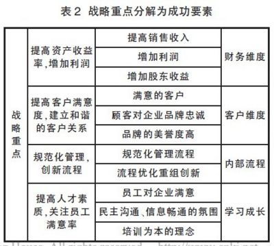 第三,关于内部流程维度。流程的效率和质量控制无疑是关键, 为此公司必须注重规范化的管理流程以求提高服务品质及做好服务流程的优化重组,这是公司建立和谐客户关系的关键,与客户维度的指标相关联。最后,关于学习与成长维度。员工的满意度、员工能力的提高、公司是否营造出一个民主沟通、信息畅通的氛围等因素格外重要,这将直接影响内部流程的效率。按以上分析, 将战略重点分解成关键成功要素的过程如表2所示。