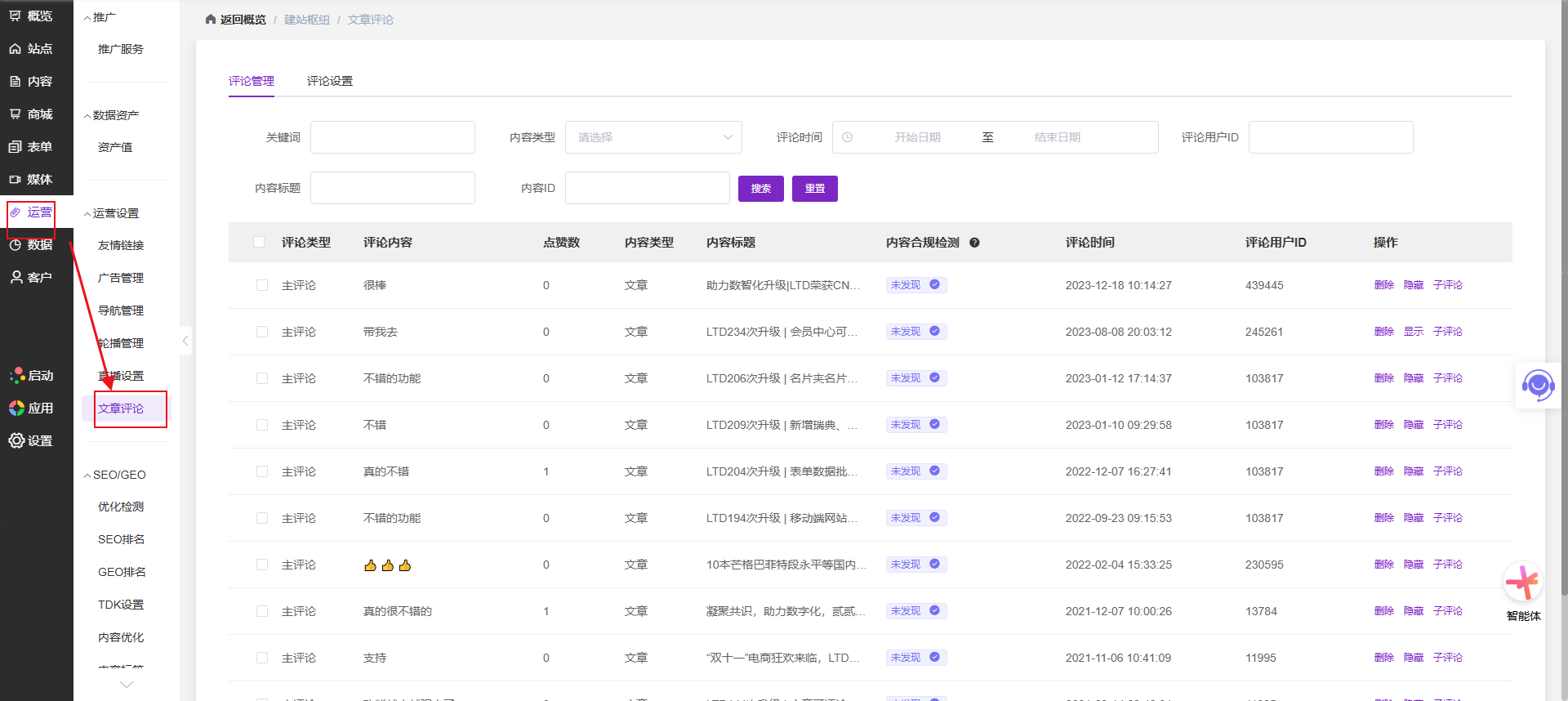 1、官微中心后台-运营-评论管理中,可以对评论进行删除、显示/隐藏、查看子评论操作。