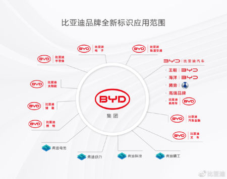 比亚迪集团新标识,将在旗下电子、新能源、轨道交通以及汽车产业中使用,与此同时,汽车产业的乘用车板块各品牌将使用各自的品牌标识。