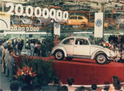 1939年2月16日,柏林车展上还展出了由费迪南·波尔舍重新设计,由希特勒命名的“KdF-Wagen”。不久,第二次世界大战爆发,大众公司开始大量生产军用汽车。1945年,战争结束,在同盟国的监督下,大众公司开始重新生产民用汽车。从此,甲壳虫汽车进入了快速、平稳的发展时期。 1972年2月17日,第15,007,034辆甲壳虫出厂,打破了福特公司T型车保持的生产纪录。8月,编号为“VW 1303”的装载40-50马力发动机的甲壳虫取代了原有的“VW 1302”,成为主流车型。1973年,大众公司将几款特制型号的甲壳虫投放市场:Jeans甲壳虫、大甲壳虫、“黑-黄比赛者”和城市甲壳虫。7月, VW 1303停止生产,1303 敞篷车(即VW 1303 A)在8月上市成为主打产品。