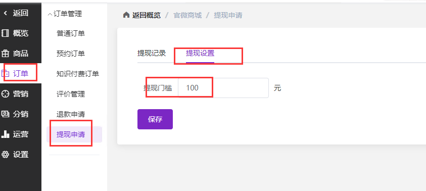 官微中心后台-商城-订单-提现申请-提现设置,在提现门槛后方输入框中可以设定一个最低提现金额,金额数值根据实际需求设定。
