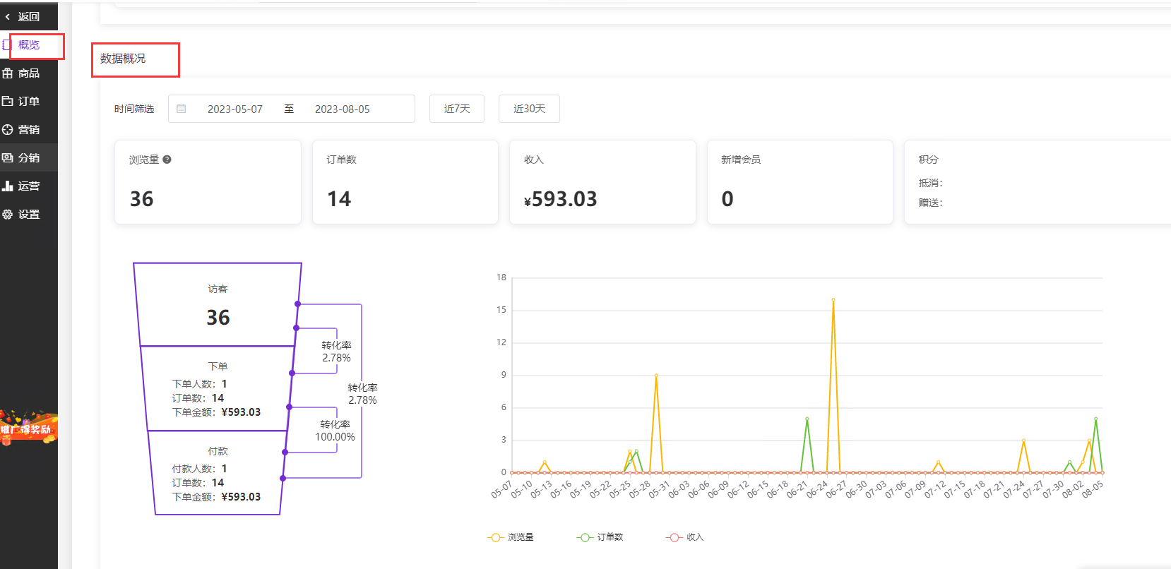 商城有数据分析统计功能,在商城概览“数据概况”中可以查看特定时间段中的订单数据、访客数和转化成交率。如下图所示: