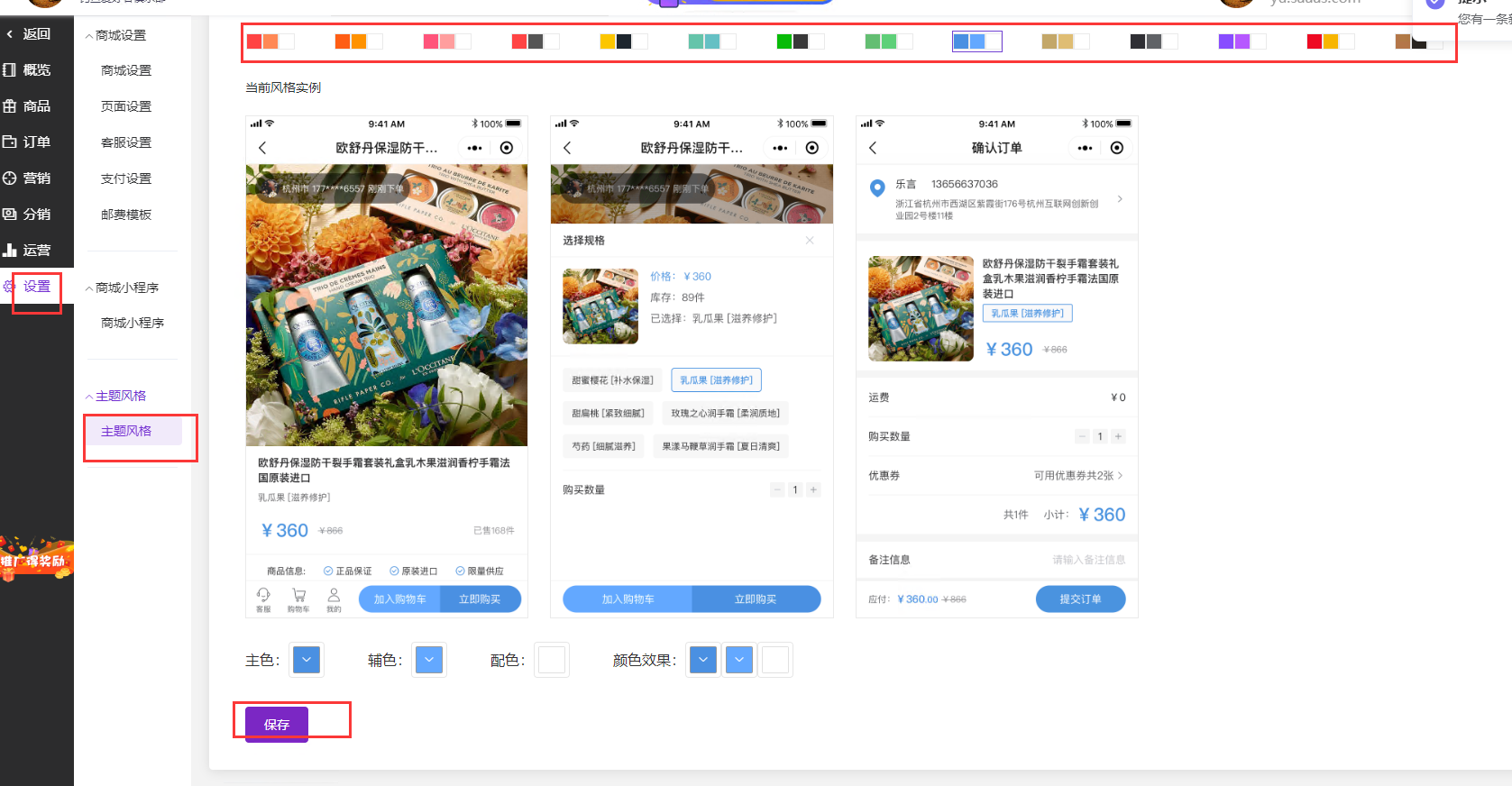 官微中心后台-商城-设置-主题风格,顶部有相应的色彩可以提供选择,或者下方主色、辅色、颜色效果等处点击打开色库进行自定义设置。设置好之后点击“保存”即可。