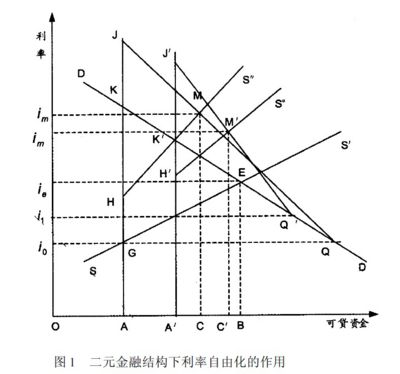 从图1 可以看出,二元金融结构下利率市场化改革仍然会起到积极的作用:一方面,利率的上升会提高投资的数量和质量。在我国,非正规金融市场吸收的资金中,有相当大一部分( 如私募基金)是用于股票和债券二级市场投资的非生产性资金,它们增大了证券市场的投机性和不稳定性。利率管制上限的提高可以使部分现金资产、非正规市场存款等非生产性资金流入官方金融市场,这不仅有利于生产性资金的增加,还有利于证券市场秩序的稳定。