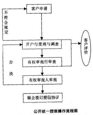 公开统一授信的操作流程同贷款操作流程一致,由客户申请、开户行受理与调查、有权审批行审查、有权审批人审批、办理担保手续、签订授信协议等组成。