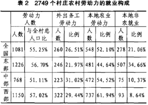 根据国务院发展研究中心对2749个村庄的调查,每个村平均拥有劳动力1081人,务农的占52.10%;转人非农产业的占47.57%。其中,本地从事非农业生产的占21.06%,外出务工的占26.51%。外出务工的比重高于本地从事非农业生产的比重,是农村劳动力转移的主要途径。但是就业结构在地区之间呈现明显的差异,东、中、西部地区在本地从事非农业生产的比重分别为34.66%,10.37%,8.64%,外出务工的劳动力比重分布为21.97%,31.02%,29.44%。中西部地区劳动力流出的比例不仅明显高于东部地区,也高于本地从事非农业生产的比例(见表2)。