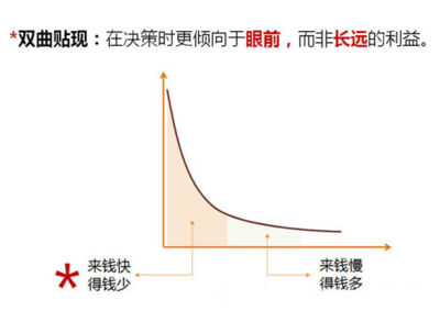 这体现出双曲贴现:多数人宁愿要金额较小的眼前酬劳,也不要金额较大的日后报酬。如上图解所示,这条曲线类似数学中双曲线,因此得名。