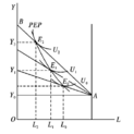 参见图2(价格扩展线)。与图1不同的一点是图2给出了三条预算约束线,分别与U0,U1,U2相切于E0,E1,E2,余皆一样。与三条预算约束线相对应的工资分别是W0,W1,W2,且W0 < W1 < W2(注意,在这里要素价格是引起预算约束线顺时针转动的唯一原因)。我们将这三个点及其他可能的切点-如果W连续变动的话-连接起来,便得到价格扩展线PEP。价格扩展线反映了随着要素价格的不断变化,自用资源数量的变动情况。
