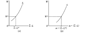 该式可用图形来加以描绘,见图4(单个消费者和整个市场的要素供给曲线)。(a)图是单个消费者的要素供给曲线Sj,(b)图是整个市场的要素供给曲线S。当要素价格为W^*时,该消费者的要素供给量为
