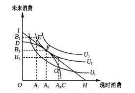 社会时间偏好率的度量方法:如图所示,横轴表示现时消费,纵轴表示未来消费,U1,U2,U3是一簇无差异曲线,反映社会全体成员对不同时期不同消费组合的不同满意程度,U1 > U2 > U3。在同一无差异曲线上,消费者对不同消费组合偏好无差异,即(A1,B1);(A2,B2);(A3,B3)。CD是社会生产可能性边界线,表示在现时技术和资源条件下,可生产的现时与未来消费量的组合轨迹,该曲线的斜率代表投资的边际生产力。为了使社会成员的福利最大化,必然选择社会生产可能性边界线与无差异曲线的切点——F点,此时均衡的社会时间偏好率即为经过F点的切线的斜率,它在数值上等于OI/OH。
